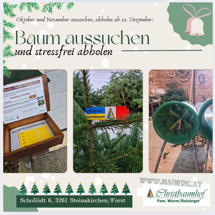 Herzlich Willkommen bei Ihrem Christbaumbauern im kleinen Erlauftal Aussuchen im Christbaumwald: Oktober u. November Strahlend wie ein schöner Traum, steht vor uns der Weihnachtsbaum. Zum Verkauf Unser Angebot Aussuchen im Christbaumwald Oktober/November Zum Christbaumwald Aussuchen im Ausstellungsraum ab 6. Dezember Zum Christbaumwald Leben und Wachsen der Bäume Setzen und Pflege Die Bäume werden mit 4 Jahren gesetzt und dann sorgsam gehegt und gepflegt. Leben u. Wachsen Setzen und Pflege Tiere am Christbaumhof Schafe unterstützen uns bei der Pflege der Bäume und Bienen liefern wertvollen Honig. Schafe Bienen Anfahrt Christbaumhof Schollödt 6, 3261 Steinakirchen am Forst Geöffnet ab 6. Dezember, täglich von 9 bis 18 Uhr. 24. Dezember von 9 bis 12 Uhr. Bildergalerie